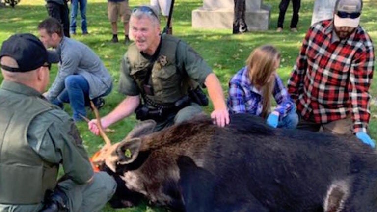 A moose took a jaunt through a Worcester cemetery on Monday.The moose was spotted in St. John’s Cemetery, according to the Worcester Telegram and Gazette.Because of the moose being in a “populated location,” Massachusetts Environmental Police that are trained in chemical immobilization were called in, a post to the department’s Facebook page said.