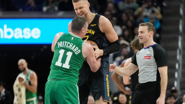 Payton Pritchard added 26 points and Sam Hauser scored 16 to help Boston win for the seventh time in eight games and spoil the Golden State debut of former Celtic Kristaps Porzingis.